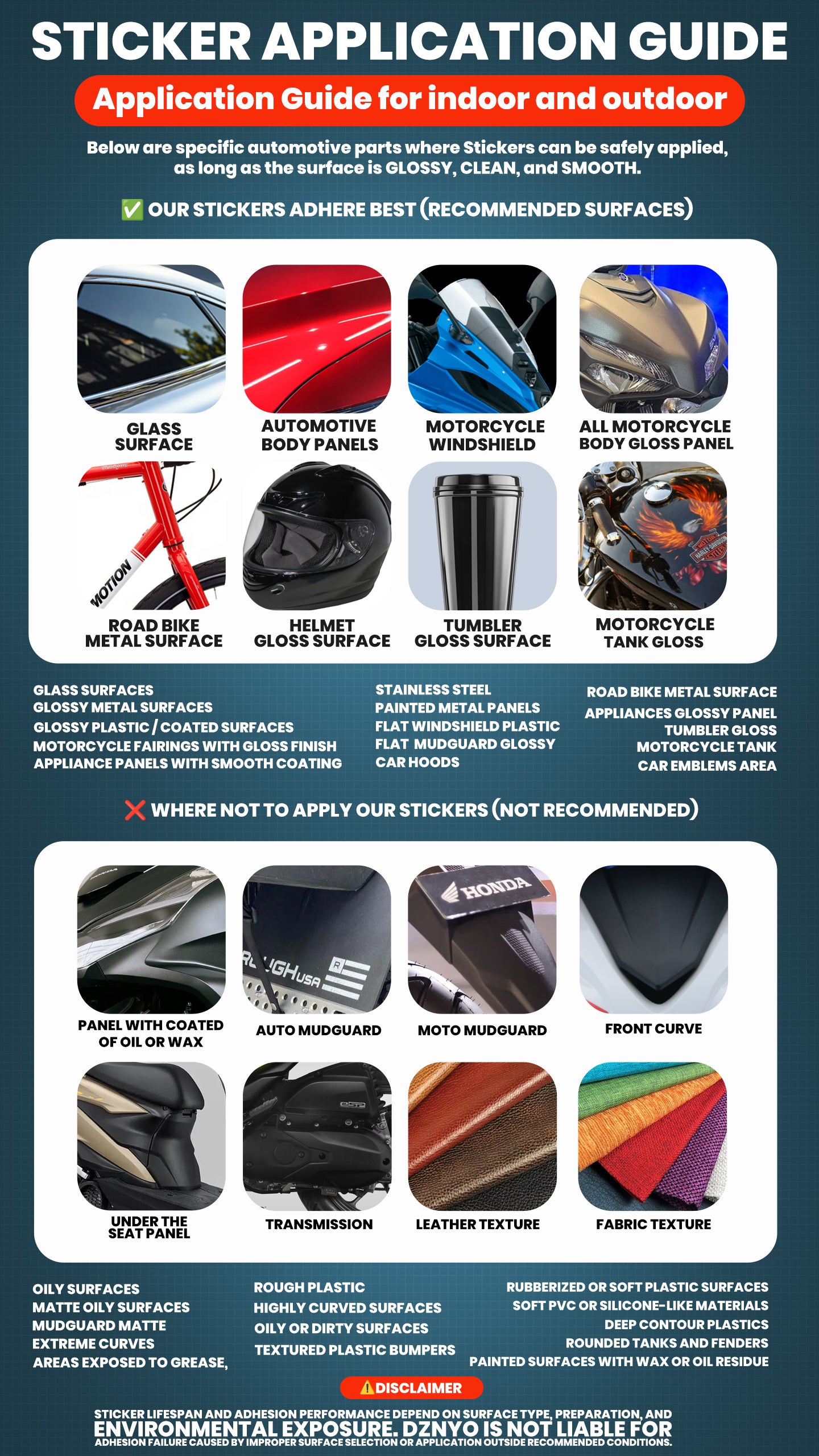 DZNYO stickers adhere best to smooth, glossy, and clean surfaces. This includes glass, automotive body panels, motorcycle fairings, helmet gloss surfaces, stainless steel tumblers, painted metal panels, and glossy plastic. These surfaces allow the adhesive to fully bond and deliver long-term outdoor performance.